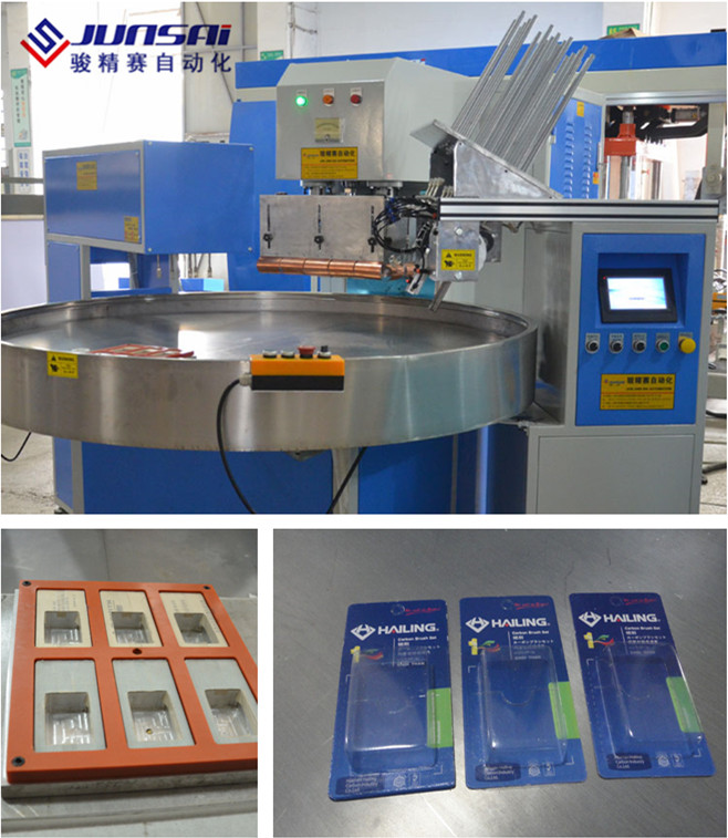 2.      用于吸塑包裝封口的高周波機器,使用時可根據吸塑包裝的產品尺寸大小,來決定一次同時包裝一個或多個產品。工作臺自動旋轉,3-6工位可選擇,工作效率更高。